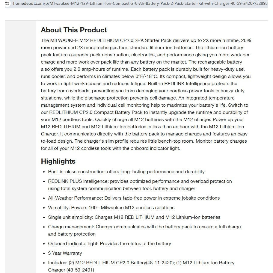 The Milwaukee M12 REDLITHIUM CP2.0 2PK Starter Pack offers up to double the runtime, 20% more power, and twice the recharges compared to standard lithium-ion batteries. Its robust, high-performance battery pack ensures more work per charge and extended pack life.