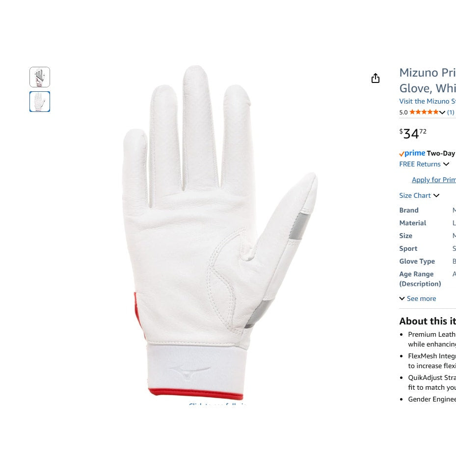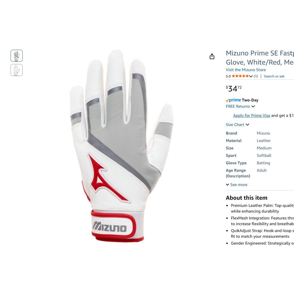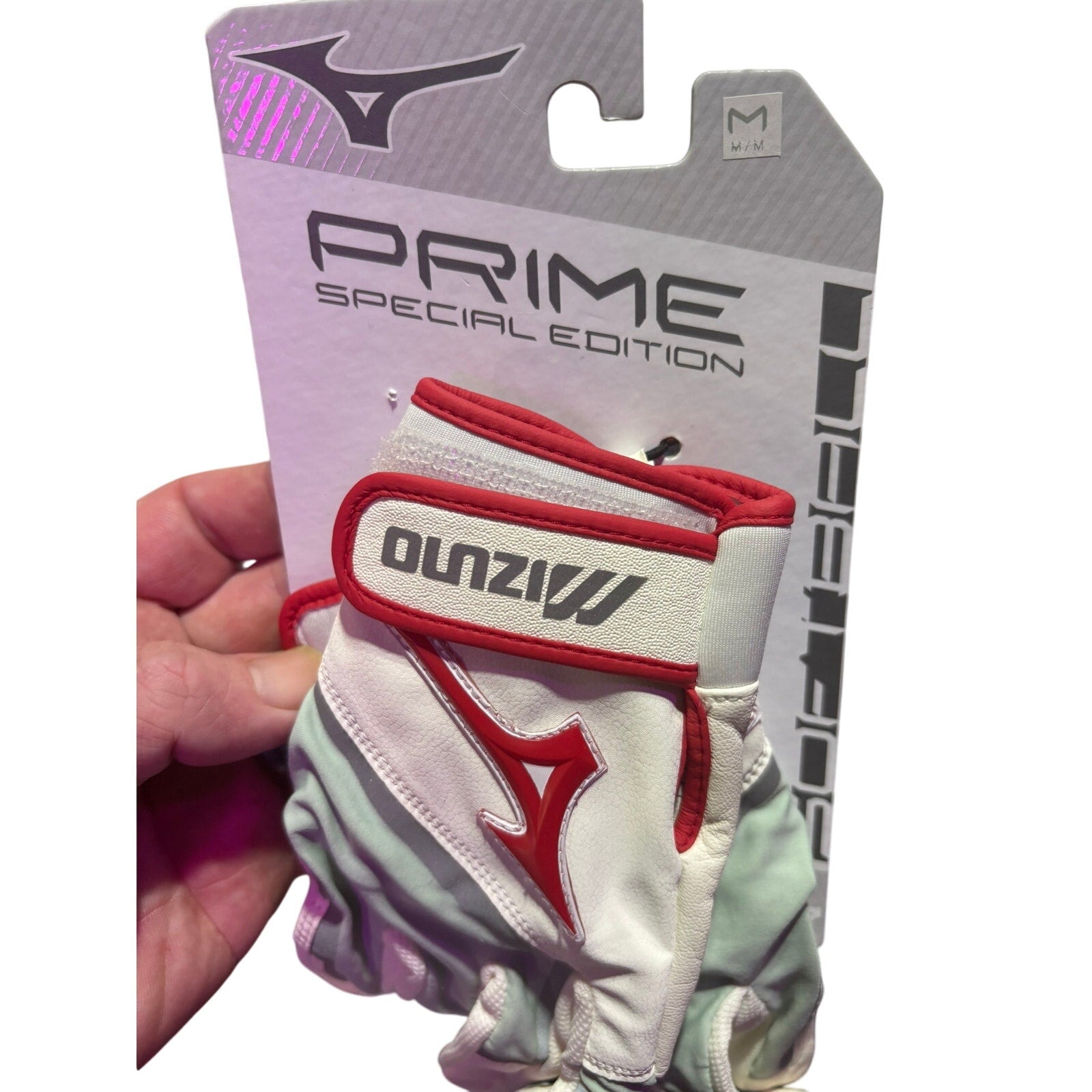 Mizuno Prime SE Softball Fastpitch Batting Gloves White/Red, Medium 889961366789