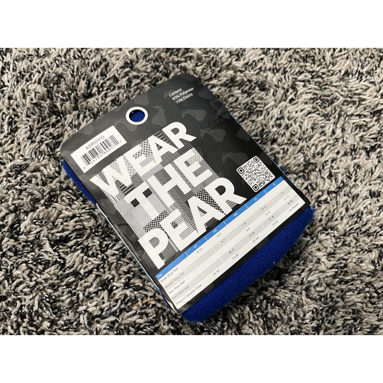 The product is a pair of NWT WEAR THE PEAR Soccer TALL Socks in ROYAL BLUE, designed for intermediate teen boys or girls in size 9-11. Made by the brand PEAR SOX in the United States, these knee-high sports socks are crafted from polyester material. The royal blue color and tall size make them perfect for young athletes playing soccer or other sports.